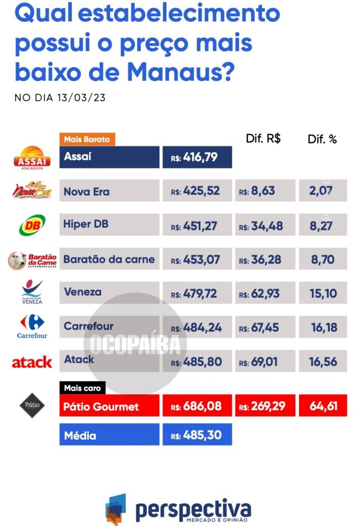 Pesquisa da empresa Perspectiva Mercado e Opinião divulgada nesta terça-feira, 14/03, aponta que a rede Assaí comercializa os produtos com preços mais baixos em Manaus, enquanto que o Pátio Gourmet vende os mais caros.