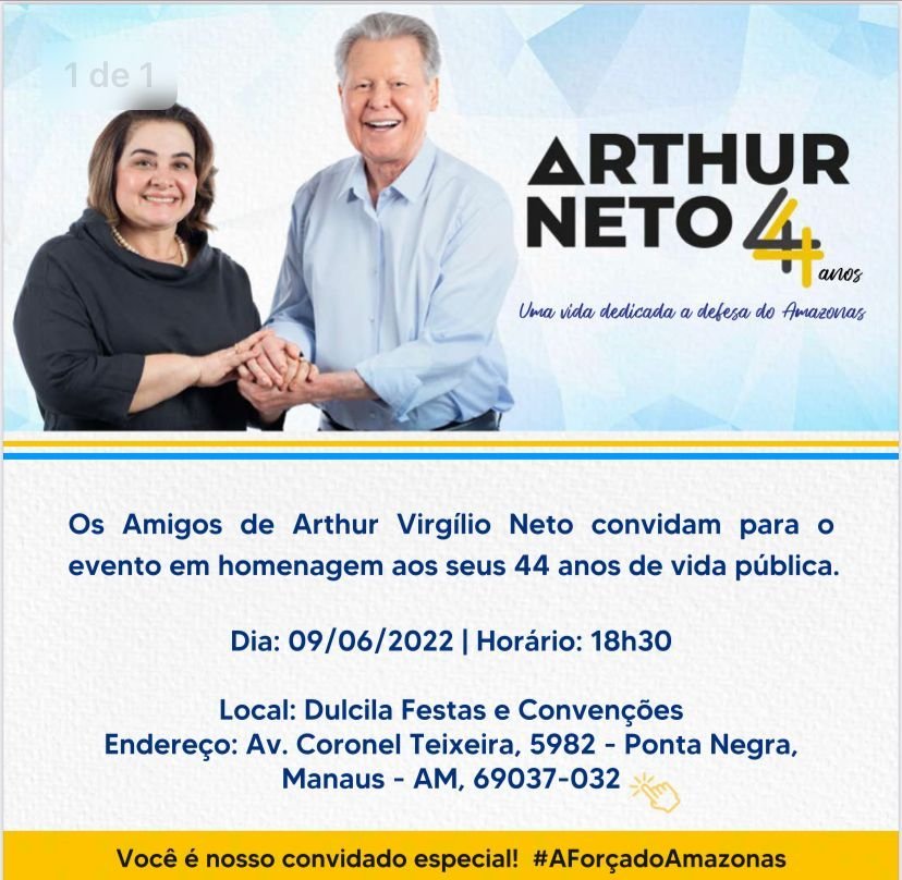 Mamaus- O Ex- Prefeito Arthur Neto está distribuindo convite para participarem de evento em homenagem aos seus 44 anos de vida pública.