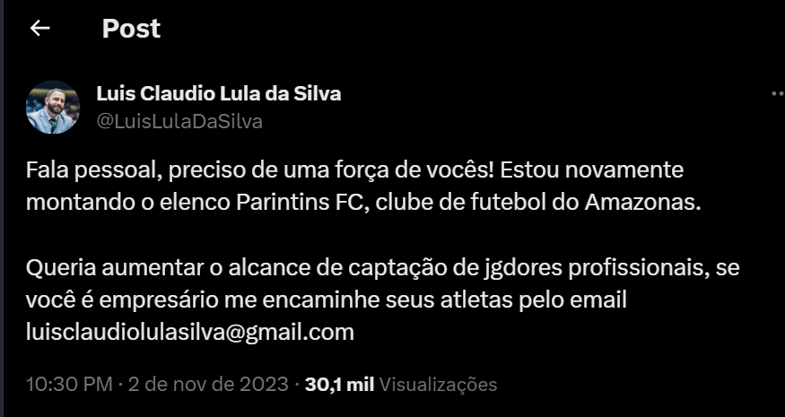Nesta quinta-feira (2), Luís Claudio Lula da Silva, dirigente do Parintins FC e filho do presidente Luiz Inácio Lula da Silva, fez um post nas redes sociais em busca de apoio para o clube amazonense. O pedido de ajuda visa fortalecer o elenco do Parintins FC para a disputa do Campeonato Amazonense de 2024.