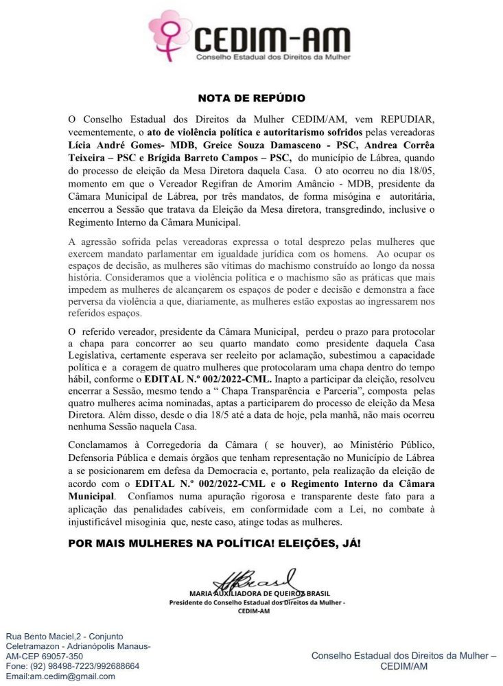 Hoje, o Conselho Estadual dos Diretos da Mulher CEDIM/AM publicou uma nota repudiando os atos do atual Presidente.