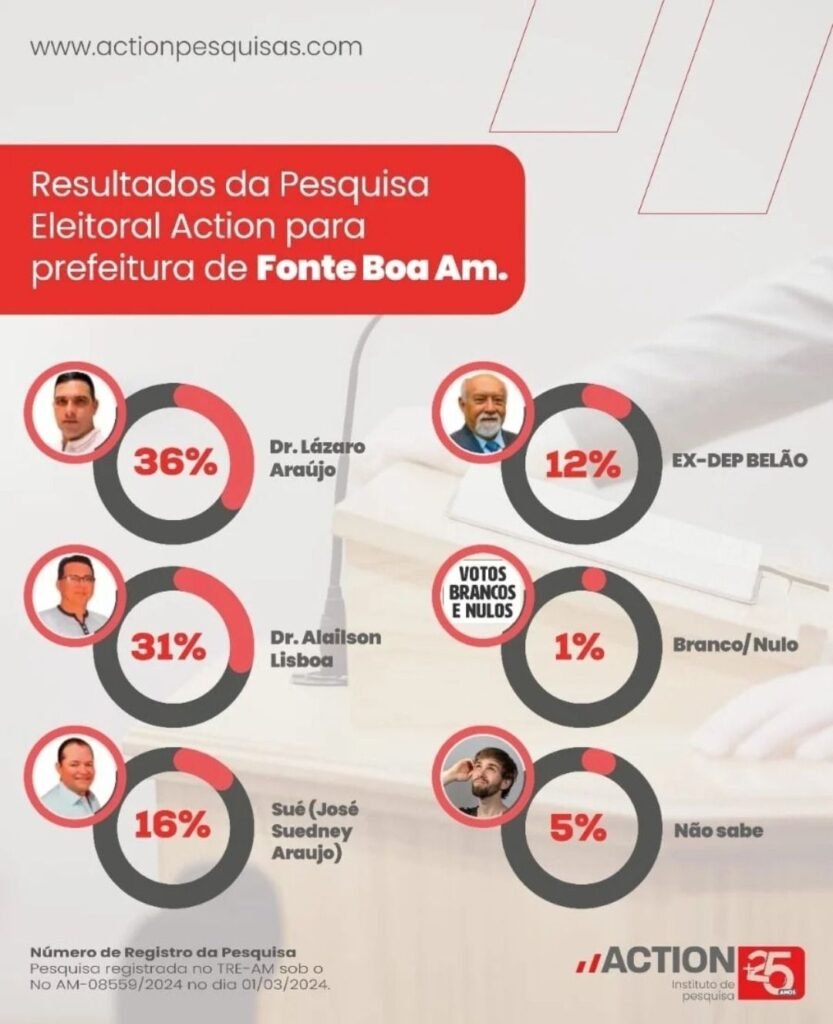 O Instituto Action realizou pesquisa eleitoral em Fonte Boa (AM), registrada sob o n° AM-08559/2024. Os resultados mostraram acirradas disputas em diferentes cenários entre os possíveis pré-candidatos à prefeitura.
