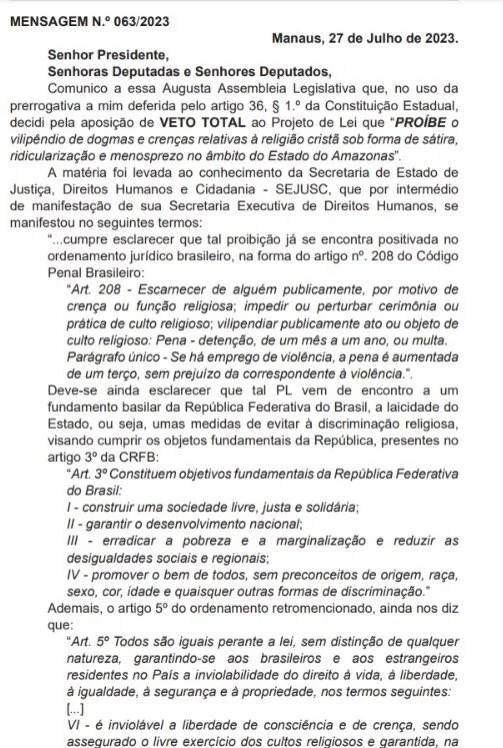 “Deve-se ainda esclarecer que tal PL vem de encontro a um fundamento basilar da República Federativa do Brasil, a laicidade do Estado, ou seja, umas medidas de evitar à discriminação religiosa, visando cumprir os objetos fundamentais da República“, completou o mandatário.