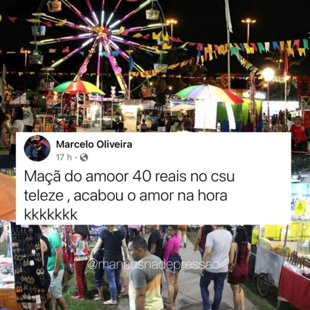 Segundo os relatos, um dos itens mais procurados e típicos das festas juninas, a maça do amor, está custando R$ 40 e tem dado o que falar. “Maça do amor R$ 40 no CSU. Tu é leso é, acabou o amor na hora”, escreveu um rapaz.