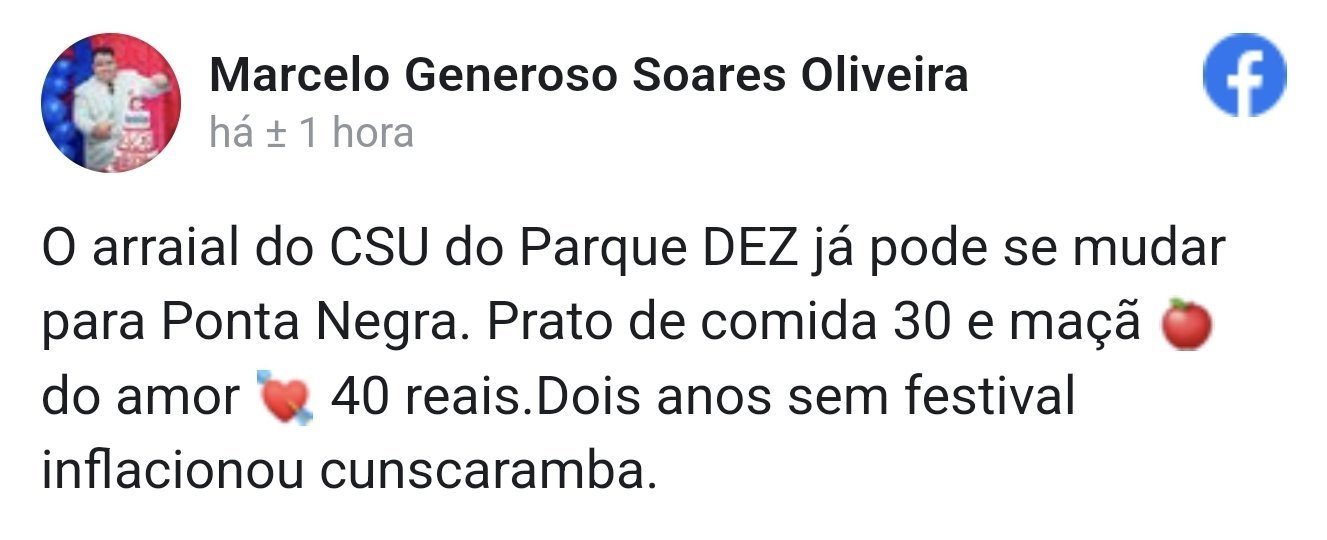 “O arraial do CSU do Parque Dez já pode se mudar para Ponta Negra. Prato de comida R$ 30 e maçã do amor R$ 40 reais. Dois anos sem festival inflacionou cunscaramba”, escreveu o jornalista Marcelo Generoso.