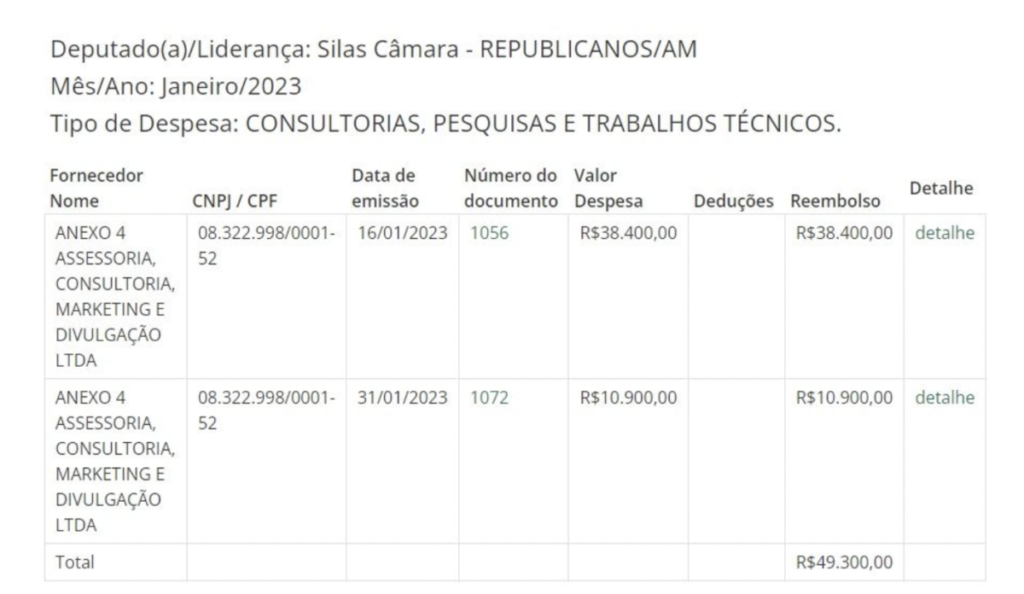 O Portal CM7 Brasil apurou que a ex-assessora do parlamentar, Emília Arcanjo Nascimento, recebeu um valor de R$ 49,3 mil somente no mês de janeiro para prestar serviços de consultoria, pesquisa e trabalhos técnicos. A contratação da funcionária em questão ocorreu através da empresa Anexo 4, que presta serviços de assessoria, marketing e divulgação.