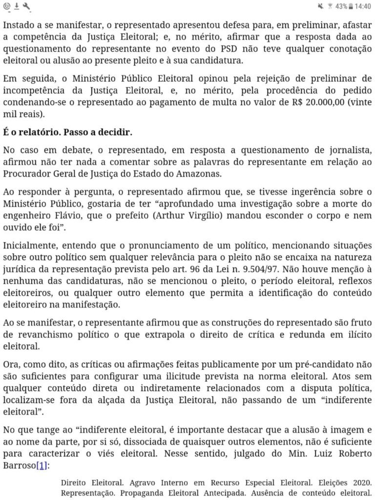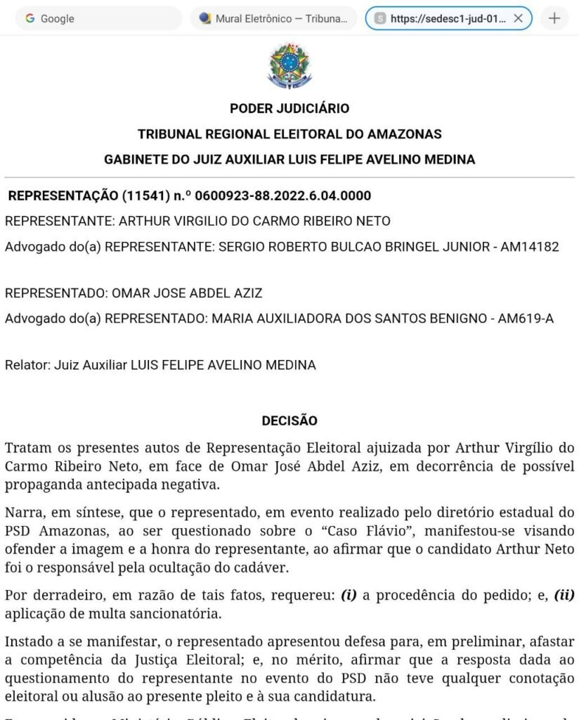 Arthur havia ingressado com uma nova ação referente ao caso contra o também candidato ao senado Omar Aziz (PSD). Na ação, o ex-prefeito alega se sentir ofendido com possíveis afirmações feitas por seu adversário.
