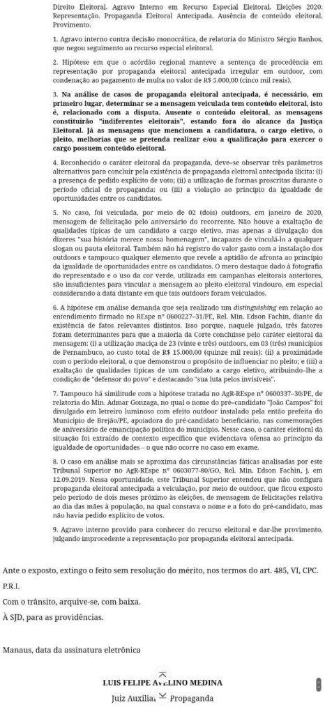 De acordo com o relator Felipe Medina, não houve menção à nenhuma das candidaturas, nem do pleito, período eleitoral, reflexos eleitoreiros ou qualquer outro elemento que permita a identificação do conteúdo eleitoreiro na manifestação. “No que tange ao ‘indiferente eleitoral, é importante destacar que a alusão à imagem e ao nome da parte, por si só dissociada de quaisquer outros elementos, não é suficiente para caracterizar o viés eleitoral”, diz trecho da decisão.