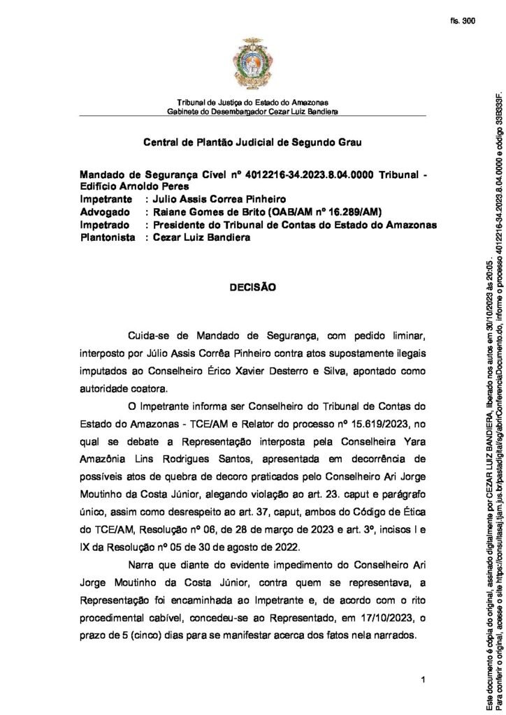O Tribunal de Justiça do Amazonas (TJ/AM) emitiu uma decisão que obriga o Presidente Érico Desterro a votar o afastamento de do conselheiro Ari Moutinho do Tribunal de Contas do Estado do Amazonas (TCE-AM).