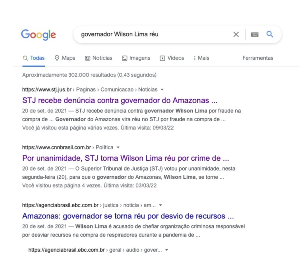 Busca realizada, nesta quarta-feira (09/03) com as palavras ‘governador Wilson Lima réu’, no serviço de buscas do Google, o maior e mais usado programa de buscas na internet, onde é possível fazer pesquisas sobre qualquer tipo de assunto ou conteúdo, gerou mais de 300 mil respostas.